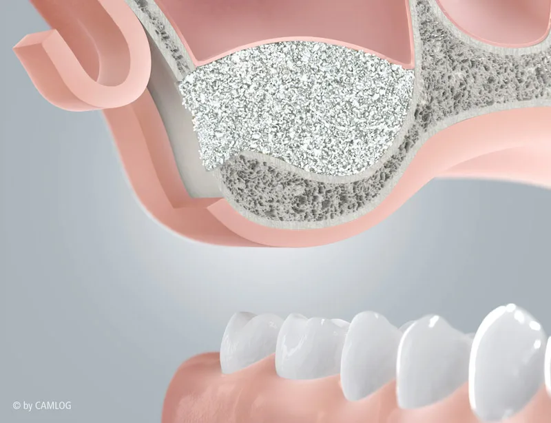 Dabei wird der Boden der Kieferhöhle vorsichtig angehoben und der entstandene Raum mit Knochenmaterial